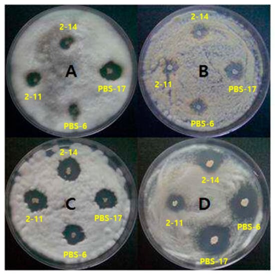 Bacillus strains isolated from soil samples collected from Mt. Naejang in the Republic of Korea were tested for antimicrobial activity against Fusarium solani, Aspergillus flavus, Penicillium sp., and Fusarium oxysporum. As shown in Figure 1, a clear zone indicating antibacterial activity was observed in the culture solutions of four isolated Bacillus strains (2-11, 2-14, PBS-6, and PBS-17). Among the isolated strains, PBS-6 and PBS-17 exhibited the strongest antibacterial activity against F. oxysporum, followed by the 2-14 and 2-11 strains. Similarly, all four isolated strains demonstrated comparable antibacterial activity against Penicillium sp. and F. solani, and the PBS-17 and 2-11 strains presented the highest antibacterial activity. Although all four strains displayed weak antibacterial activity against Aspergillus flavus, the PBS-17 strain exhibited the highest activity among them.