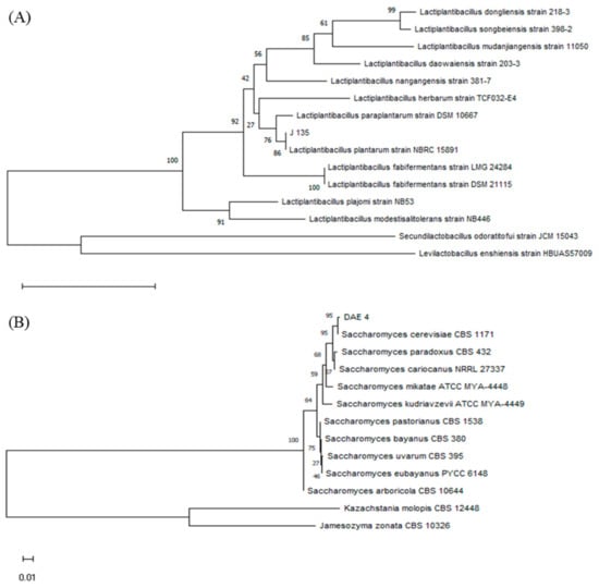 The J-135 and DAE-4 strains were identified through 16S rRNA analysis, following the same method as PBS-17. The J-135 and DAE-4 strains showed 99% homology to the 16S rRNA gene sequence of Lactiplantibacillus plantarum NBRC 15891 and Saccharomyces cerevisiae CBS 1171, respectively, recorded in the GenBank database of the National Center for Biotechnology Information. After constructing and analyzing the neighbor-joining phylogenetic tree (Figure 4), strains J-135 and DAE-4 exhibited the closest evolution distance with the L. plantarum and S. cerevisiae strains, and therefore these were identified as Lactiplantibacillus plantarum J-135 (L. plantarum J-135) and Saccharomyces cerevisiae DAE-4 (S. cerevisiae DAE-4).