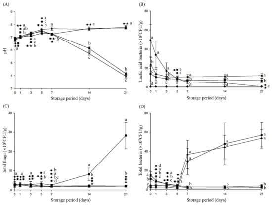 First, as shown in Figure 5A, during the 3-week fermentation period, the pH of the untreated group (▲) and control group 1 (●) remained between 7 and 8. In contrast, in control group 2 (■) and the experimental group (×), the pH started to decrease after day 5 and eventually stabilized at approximately 4.0 by the end of the 3-week period. As depicted in Figure 5B, LAB were barely detected in the untreated group (▲), whereas in control group 1 (●), the initial LAB count decreased gradually over the fermentation period. In control group 2 (■), the LAB count decreased until day 7, after which it stabilized. In the experimental group (×), the LAB count decreased until day 3 but then remained steady, with the LAB count after 3 weeks being approximately double that of control group 2 (Figure 5B). For fungal counts (Figure 5C), minimal changes were observed in the untreated group (▲), control group 1 (●), and experimental group (×), whereas control group 2 (■) showed an increase starting on day 7, followed by a rapid spike on day 14. With respect to the total bacterial count (Figure 5D), both the untreated group (▲) and control group 1 (●) exhibited a rapid increase after 5 day, whereas control group 2 (■) and the experimental group (×) presented relatively stable and low fluctuations in bacterial numbers.