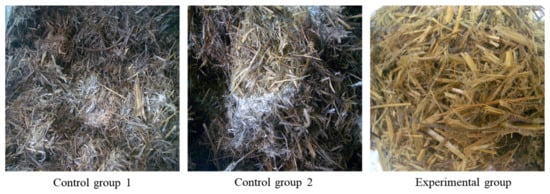 As shown in Table 3, the initial fungal count in the silage was similar for both the strain-treated and untreated groups. However, after 6 months, the fungal count in the untreated group increased 27.4-fold in rye, 20.8-fold in whole wheat barley, and 185-fold in reed. After 12 months, the fungal count further increased dramatically by 43-fold in rye, 58-fold in whole wheat barley, and 220-fold in reed. In contrast, in the strain-treated group, the fungal count increased slightly, by 0.2-fold in rye, 0.4-fold in whole wheat barley, and 0.9-fold in reed after 6 months, and by 0.2-fold in rye, 0.4-fold in whole wheat barley, and 1.7-fold in reed after 12 months. Over time, the fungal count in the untreated group was approximately 100-fold greater than that in the treated group, and a significant amount of mold was observed on the surface of the silage in the untreated group (Figure 3).