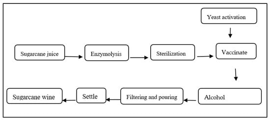The sugarcane fermentation process was performed according to Chen et al. [10]. Firstly, take fresh sugarcane juice of different cultivars, add 0.10% (by mass volume ratio of sugarcane juice) of pectinase, perform enzymolysis at 40 °C for 1 h, then sterilize in a 70 °C water bath for 30 min, and cool at room temperature (RT), add activated yeast (by mass volume ratio of sugarcane juice, 0.10%) to the sugarcane juice, and ferment at fermentation temperature (25 °C). After 10 days of fermentation, the main fermentation was terminated, and filtration, backflow, aging, and other treatment processes were carried out. All wine samples were centrifuged at 534× g for 5 min; supernatants were collected and stored for further analysis (Figure 1).
