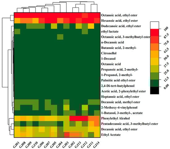 Heat map of key volatile flavor compounds in sugarcane wines.