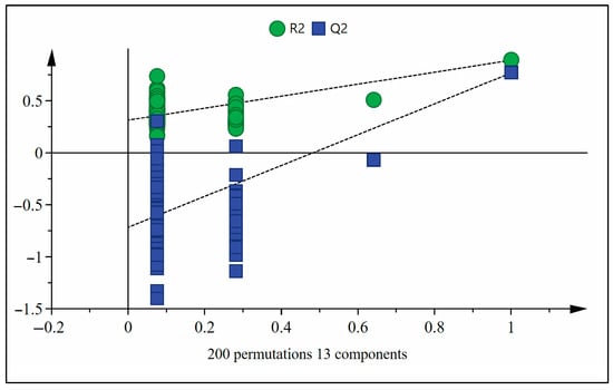 The OPLS-DA model was subjected to 200 permutation tests to verify whether the OPLS-DA model was overfitting. The verification results are shown in Figure 5. R2 = 0.313, Q2 = −0.716, the intercept of Q2 with the Y-axis was less than zero, and all Q2 values on the left were smaller than those on the right, indicating that the model fits the data well and is stable [51].