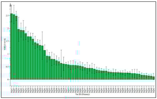 The weighted important variables (VIP) can provide an important reference for identifying variables that have a significant impact on classification. They are usually used to explain the contribution of variables to the model. Variables with a VIP value greater than 1 are important variables [39,52]. Using VIP > 1 and p < 0.05 as the screening criteria, 14 different varieties of sugarcane wine were screened for different aroma compounds (Figure 6 and Table 6). From the changes in their relative contents, it can be seen that the contents of 15 aroma compounds in different varieties of sugarcane wines are different to varying degrees. The main aroma compounds are Octanoic acid, ethyl ester, 1-Butanol, 3-methyl, Decanoic acid, ethyl ester, Ethyl 9-decenoate, Dodecanoic acid, ethyl ester, Palmitic acid ethyl ester, 2,4-Di-tert-butylphenol, Acetic acid, Octanoic acid, 2-Butanol, n-Decanoic acid, 1-Propanol, 2-methyl-, Ethyl 9-hexadecenoate, and Ethyl acetate. However, OPLS-DA and one-way ANOVA can be used to screen the above compounds to identify the characteristic differences in compounds of wines prepared from different cultivars of sugarcane.