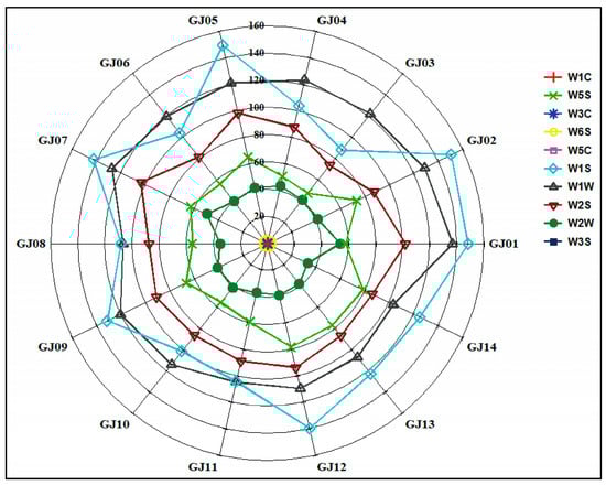In order to further explore the differences and distribution characteristics of aroma compounds in sugarcane wine produced from different sugarcane cultivars, a highly sensitive electronic nose was applied to conduct the research analysis. Based on the response values of different sugarcane wines on 10 sensors of the electronic nose, the radar fingerprint of sugarcane wines is shown in Figure 8.