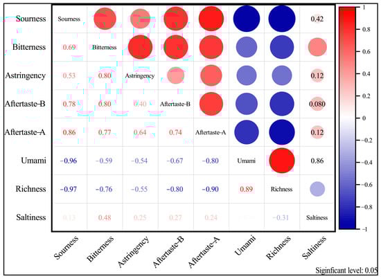 Coherence analysis of the response value of each electronic tongue taste indicator on a variety of wines (p < 0.05).
