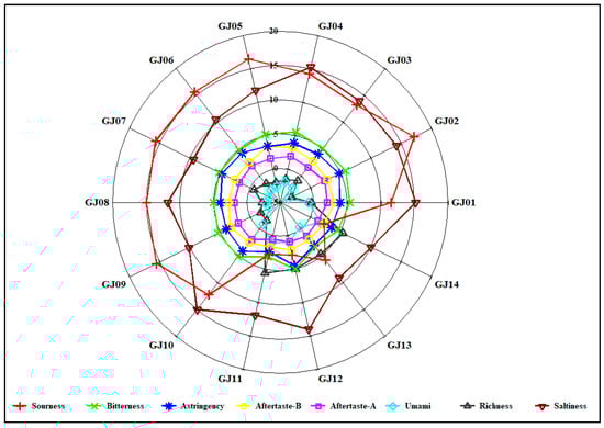 As shown in Figure 10, except for saltiness, there was no significant difference in the taste, aftertaste B, and astringency of different varieties of sugarcane wine (p > 0.05). Sourness, bitterness, astringency, umami, aftertaste A, aftertaste B, and abundance data were significantly different in the taste of different varieties of sugarcane wine (p < 0.05). Based on the response values of different sugarcane wines on eight sensors of the electronic tongue, the radar fingerprint of sugarcane wines is shown in Figure 10.