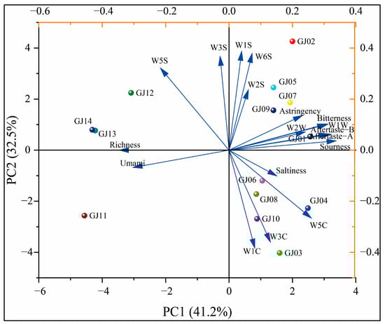 As shown in Figure 13, the PCA showed that the characteristics are mainly focused on the first two principal components. The variance contribution rate of the first principal component is 41.2%, the variance contribution rate of the second principal component is 32.5%, and the cumulative contribution rate is 73.7%. This main information can reflect the differences in the overall aroma between the different sugarcane wines. The 14 different varieties of sugarcane wines are relatively scattered in the PCA, except that GJ13 and GJ14 are relatively close and in the same quadrant, indicating that the aroma and taste of these two sugarcane wines are similar. GJ11 is alone in the third quadrant, and its loading diagram is positive with umami and richness, indicating that its aroma and taste are different from others, and the umami is prominent. GJ01 has prominent sourness and bitterness, and the aroma of organic sulfur and aldehyde ketone compounds are prominent. Other fruit wines are more evenly distributed in the second and fourth quadrants and can be better distinguished.