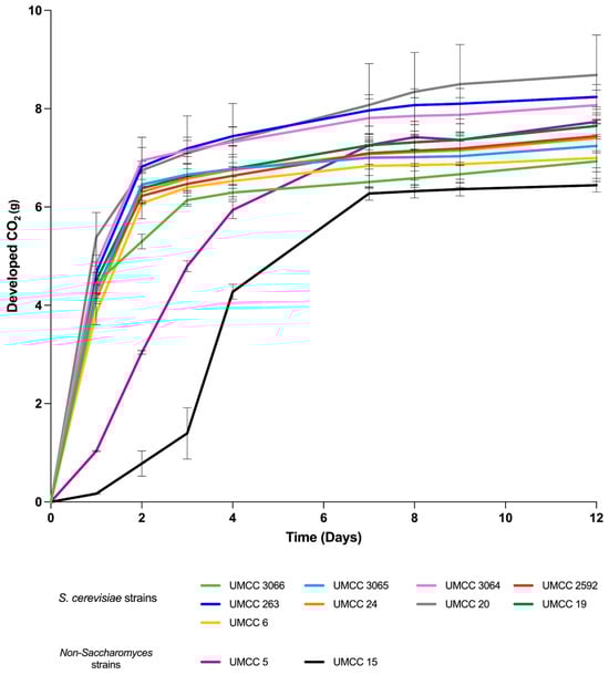 Developed CO2 over 12 days of microfermentative trials in grape juice. Data are expressed as the mean of triplicate measurements ± standard deviation.