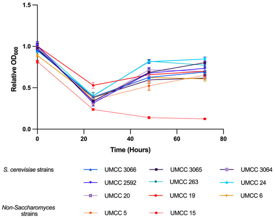 Growth curves of yeast strains in YPD broth supplemented with 10% (v/v) ethanol. Data are presented as relative OD600 values, normalized to the OD600 of the control (yeast grown without ethanol).