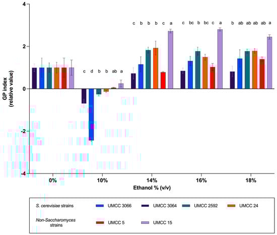Membrane fluidity expressed as relative GP index values for strains UMCC 3066, UMCC 3064, UMCC 2592, UMCC 5, and UMCC 15. Significant differences among strains at the same ethanol concentration are indicated by different letters (p < 0.05).