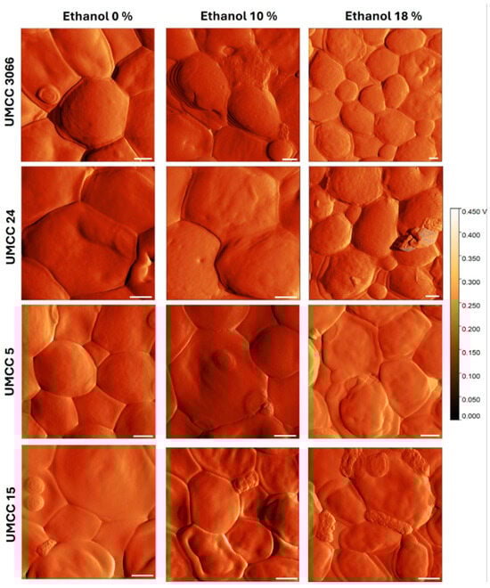 AFM error mode images of UMCC 3066, UMCC 24, UMCC 5, and UMCC 15 after exposure to 0%, 10%, and 18% (v/v) of ethanol. Scale bars: 1 µm.