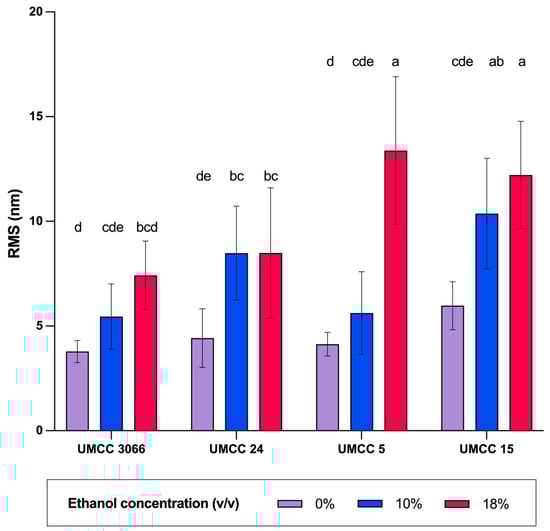 RMS values of UMCC 3066, UMCC 24, UMCC 5, and UMCC 15 after exposure to 0%, 10%, and 18% (v/v) of ethanol for 24 h. Data are expressed as mean ± standard deviation, obtained from 10 images for each sample. Significant differences are indicated by different letters (p < 0.05).