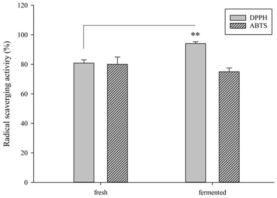 The antioxidant activity of fresh cabbage and LAB fermented cabbage. Each value is expressed as means (n = 3), and standard deviations are shown as error bars. Values marked by ** (p < 0.01) are significantly different according to an independent sample t-test. Fresh: fresh cabbage, fermented: fermented cabbage.