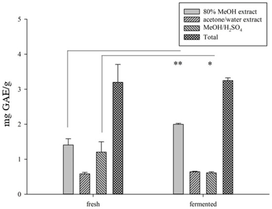 Phenolic contents of fresh cabbage and lactic-acid-fermented cabbage. Each value is expressed as means (n = 3), and standard deviations are shown as error bars. Values marked by * (p < 0.05) and ** (p < 0.01) are significantly different according to an independent sample t-test. Fresh: fresh cabbage, fermented: fermented cabbage.