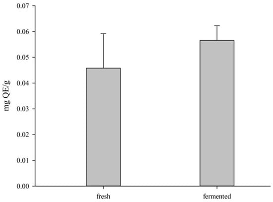 The total flavonoid contents of fresh cabbage and lactic-acid-fermented cabbage. Each value is expressed as means (n = 3), and standard deviations are shown as error bars. Fresh: fresh cabbage, fermented: fermented cabbage.