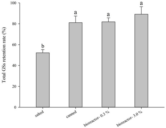 The total glucosinolate retention of lactic-acid-fermented cabbage produced by different processes. Each value is expressed as means (n = 3), and standard deviations are shown as error bars. Values marked by different letters are significantly different according to Duncan’s multiple range test (p < 0.05). Salted: dehydrated cabbage by salted; canned: lactic-acid-fermented cabbage produced via small-scale production; bioreactor-0.3%: lactic-acid-fermented cabbage produced via the 5 L bioreactor with a 0.3% microbial inoculation size; bioreactor-3.0%: lactic-acid-fermented cabbage produced via the 5 L bioreactor with a 3.0% microbial inoculation size.