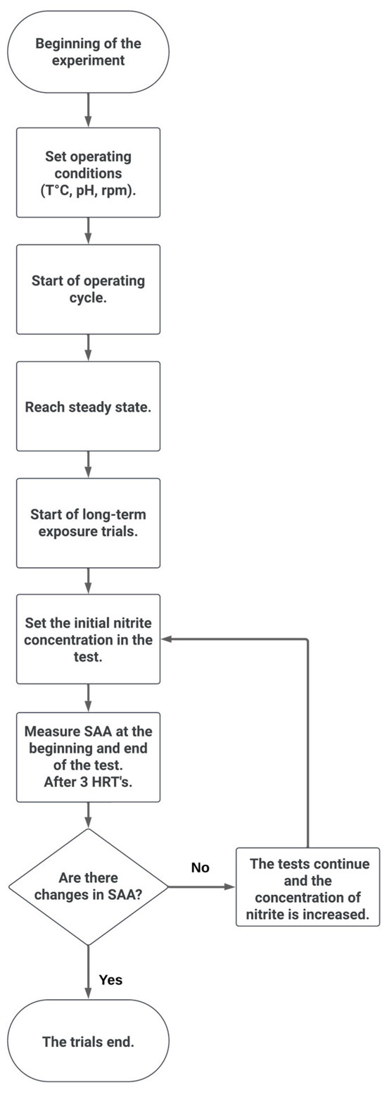 Once a steady state was reached in the reactor, the extended nitrite exposure experiments were initiated. These consisted of subjecting the sludge present in the reactor at the beginning of each cycle to three HRTs at a defined nitrite concentration. To ensure this condition, a sample was taken at the end of each cycle, and the feed concentration for the next cycle was adjusted, if necessary. At the beginning and end of each experiment (at the beginning and after three HRTs), the SAA of the sludge was measured, and significant changes in its values were evaluated. If there were no changes at the initial nitrite concentration studied, that experiment was concluded, and a new one was initiated at a higher concentration. The initial nitrite values studied were 15 mg N-NO2−/L and 30 mg N-NO2−/L. To replicate the typical concentration to which the granules were exposed in the reactor from which they originated, the ammonium concentration in the feed was modified as necessary to achieve an N-NH4+ concentration in the reactor vicinity of 200 mg N-NH4+/L.