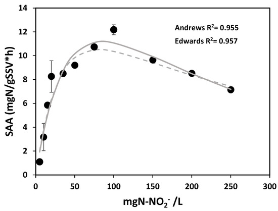 The results obtained for SAA at different nitrite concentrations in the short-term experiment were fitted to two kinetic models: the Andrews model and the Edwards model.