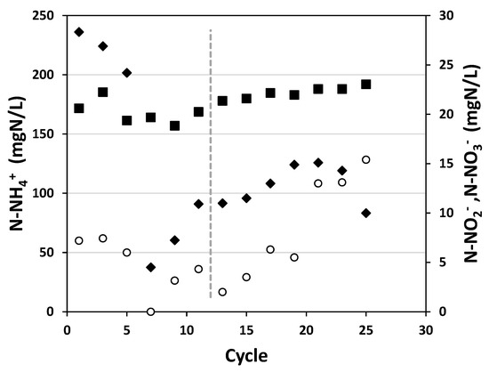 Ammonium (black square), nitrate (black diamond), and nitrite (white circle) in discharge during cycles performed in the long-term experiment in the SBR reactor. The dashed line (- -) represents the moment when the initial nitrite concentration was changed from 15 mgN-NO2−/L to 30 mgN-NO2−/L at the beginning of each cycle.