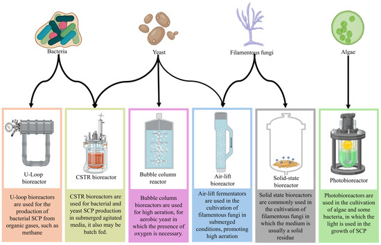 Single-cell protein production by bacteria, yeast, filamentous fungi, and algae by different industrial-scale bioreactors.