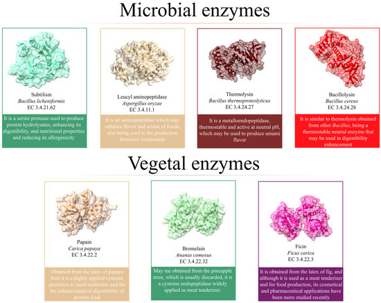 Main microbial and vegetal enzymes used in the food industry to produce flavors, protein hydrolysates, and improve protein digestibility.