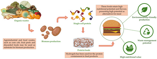 Cultured meat, in turn, represents an emerging innovation that has attracted considerable interest from both industry and research. Cultured meat is produced from animal cells grown in controlled environments to form muscle tissue, an SCP obtained from microorganisms, or by using enzymes to receive the inputs for its production. Although it still faces challenges related to scale and cost, this technology offers an alternative to conventional meat that uses less land and water and eliminates the need for animal slaughter. Several types of proteins can be used to produce these foods (Table 1), such as soy, fungal, and algal proteins, which can be used as a substrate for the production of proteins, such as basmati rice, which can be used to produce fungal proteins [24], or the generation of composites, such as hydrogels that simulate meat and can be consumed, like hamburgers. Although advances are still needed in flavor and texture, sensory analyses have demonstrated these products’ high potential as meat substitutes [25].