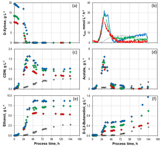 All mixotrophic processes’ carbon balances varied between 90% and 105% recovery. The strong improvement in alcohol production was also reflected in the final alcohol-to-acid ratios. What is particularly significant is that once the maximal CDW concentration was achieved, acetate was completely converted to ethanol regardless of the initial D-xylose concentrations. The final alcohol-to-acid ratio of the process with 10.3 g L−1 D-xylose was 57.60 g g−1, and the batch processes with 13.7 g L−1 D-xylose and 19.3 g L−1 D-xylose showed alcohol-to-acid ratios of 34.88 g g−1 and 25.60 g g−1, respectively, in contrast to the alcohol-to-acid ratio of the autotrophic reference process (2.64–2.68 g g−1). The results of Mann et al. [60], where a simultaneous utilization of D-xylose and CO was studied with C. autoethanogenum in a fed-batch process, showed no conversion of acetate to ethanol. As a result, the final concentration of acetate exceeded 18.28 g L−1, while the final concentration of ethanol was 1.77 g L−1 (final alcohol-to-acetate ratio of ~0.1 g g−1). The difference to our study may be that D-xylose is strongly limiting in the fed-batch process.