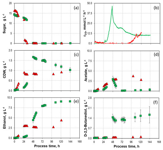 Unlike in the mixotrophic batch processes involving D-xylose and L-arabinose, there was no simultaneous consumption of CO and D-fructose (Figure 4a,b). During the first 34 h, only D-fructose was utilized by C. autoethanogenum, and after a delay of 88 h, CO consumption started. The total CO consumption was 70% lower compared to the autotrophic batch process with L-arabinose. Unlike in the batch process with L-arabinose, complete conversion of acetate to ethanol was not observed. The maximum CDW concentration was much lower compared to the mixotrophic L-arabinose conversion process (Figure 4c,d). The final ethanol concentration was 4.44 g L−1, 50% lower compared to the process using L-arabinose (Figure 4e). Furthermore, only low concentrations of D-2,3-butanediol (0.12 g L−1) were detected (Figure 4f).