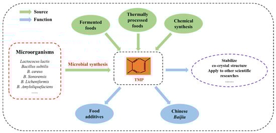 As a source of food aroma, researchers have been focusing on uncovering the generation mechanism of TMP and developing new strategies for promoting TMP formation. This study provides information about what microorganisms may participate in the formation of TMP in traditional fermented foods and proposes a possibility for higher-efficiency production of TMP by using microorganisms. Biosynthetic methods with high yield, safety, and low environmental pollution to produce TMP are needed for a wider range of applications in the future. However, there is still a need to strengthen and deepen awareness of the formation of TMP and other alkylpyrazines in fermented foods to obtain high-quality functional foods and beverages. Furthermore, attention should also be paid to the analysis of the functions of various genes in the TMP biosynthesis pathways, which will contribute to the construction of high-yield TMP engineering strains and lay a certain theoretical foundation for effectively controlling the production and application of TMP in the future.
