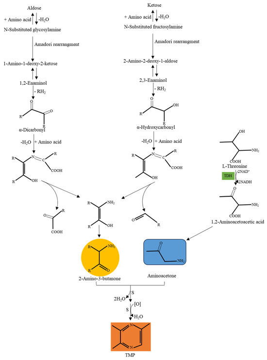 At present, the production of TMP mostly depends on chemical methods, but compared with biosynthesis, chemical methods have a greater destructive impact on the environment. TMP can be formed by the Maillard reaction, a non-enzymatic browning reaction of amino and reducing sugars during heating [15]. This reaction requires a very high temperature (more than 100 °C) to occur, and the reaction pathway is complex, resulting in many by-products [16]. Therefore, there is relatively little research on using the Maillard reaction to improve the yield of TMP. Nevertheless, studies on TMP biosynthesis are becoming more and more popular. In recent decades, simple pyrazines such as dimethylpyrazine, TMP, and tetramethylpyrazine have been reported to be derived from microbial fermentation. Although microorganisms have been discovered to produce TMP, their yields are relatively low [17,18]. Currently, the microorganisms that can synthesize TMP are Bacillus subtilis, B. sonorensis, B. licheniformis, B. amyloliquefaciens, B. cereus, Lactococcus lactis, etc. [4,19,20]. In Bacillus subtilis 168 cells, l-threonine-3-dehydrogenase (TDH) catalyzes the reaction of d-glucose and l-threonine to produce TMP [2]. The results of in vitro experiments showed that providing exogenous threonine and glucose as substrates can significantly enhance the production of TMP in Bacillus species [21]. Possible TMP biosynthetic pathways are shown in Figure 2 [1,17].