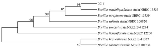 The morphology of the LC-6 colony was milky white, with a dry and flat surface and irregular edges. The LC-6 strain was Gram-stained, and the purple rod shape was observed. The LC-6 strain was identified as a Gram-positive bacterium. The neighbor-joining method in MEGA 7 was chosen to construct the phylogenetic tree. As shown in Figure 3, the genetic distance between the LC-6 strain and Bacillus amyloliquefaciens NBRC 15535 was the closest, so it was named Bacillus amyloliquefaciens LC-6 (LC-6).