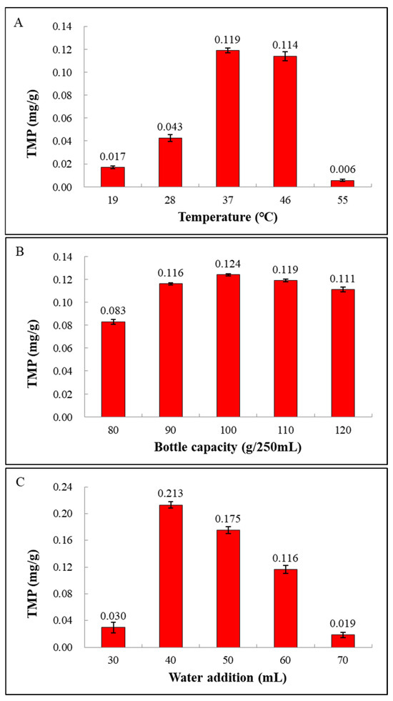 Effects of single factors on TMP production: (A) temperature, (B) bottle capacity, and (C) water addition.