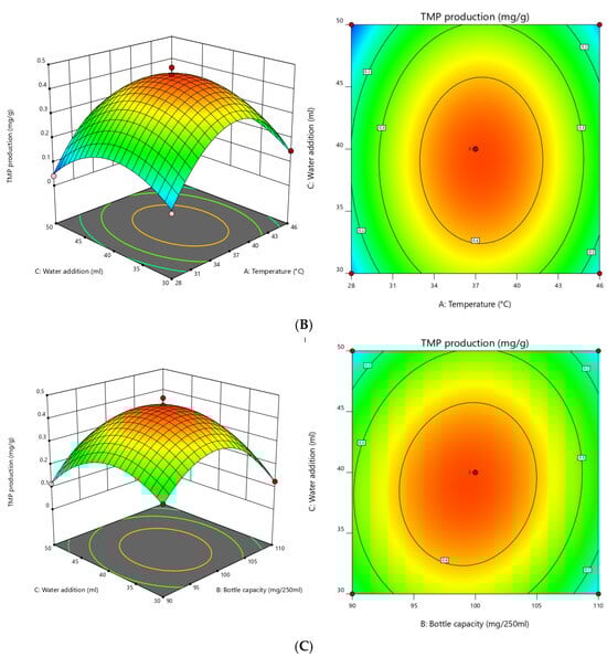 Response surface and contour plots for TMP production: (A) effect of temperature and bottle capacity, (B) effect of temperature and water addition, and (C) effect of bottle capacity and water addition.