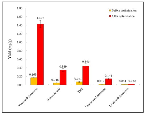 The TMP production before and after fermentation optimization were compared. TMP production before optimization was 0.071 ± 0.011 mg/g, whereas this value reached 0.446 ± 0.052 mg/g after optimization (Figure 6). Optimization increased the TMP production by 0.375 mg/g. Furthermore, the production of other volatile substances produced with TMP during fermentation had also been found to increase after fermentation optimization (Figure 6). Specifically, after optimization, the production of tetramethylpyrazine, hexanoic acid, 3-hydroxy-2-butanone, and 2,5-dimethylpyrazine increased from 0.169 ± 0.011 mg/g, 0.046 ± 0.006 mg/g, 0.017 ± 0.005 mg/g, and 0.014 ± 0.002 mg/g to 1.621 ± 0.094 mg/g, 0.349 ± 0.033 mg/g, 0.144 ± 0.022 mg/g, and 0.022 ± 0.003 mg/g, respectively (Figure 6). The results indicated that optimization may promote the growth and metabolism of the LC-6 strain in the solid-state fermentation system.