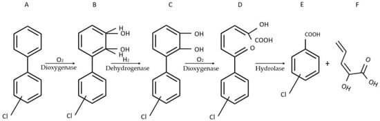 Four-step catabolic pathway of PCBs in Pseudomonas sp. P2. Adapted from Gavlasova et al. [17]. (A) biphenyl; (B) 2,3-dihydro-2,3-dihydroxybiphenyl; (C) 2,3-dihydroxybiphenyl; (D) 2-hydroxy-6-oxo-6-phenyl-2,4-hexadienoic acid (HOPDA); (E) benzoic acid; (F) 2-hydroxy-2,4-pentadienoic acid.