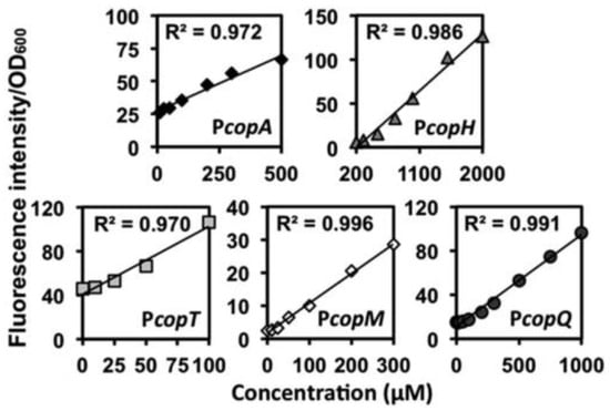 A Cupriavidus metallidurans CH34-based biosensor was developed to quantify Cu(II) ions in aquatic environments through the expression of yellow betaxanthin pigments [35]. C. metallidurans possesses the copSR regulatory system, which grants the microorganism the ability to thrive in environments with high copper levels. To produce an effective biosensor, different promoters of the cop cluster identified in the organism’s genome—PcopT, PcopQ, PcopH, PcopA, and PcopM—were first evaluated in red fluorescent protein biosynthesis assays. To identify the ideal promoter, plasmid backbones bearing copS-copR sequences under the control of native promotor and one of the candidate cop promoters driving the expression of reporter gene rfp were each transformed into C. metallidurans.