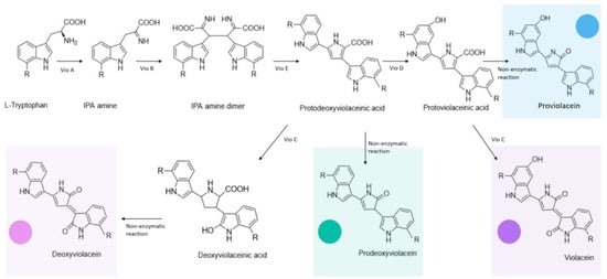 Enzymatic and non-enzymatic reactions implicated in the violacein biosynthetic pathway encoded by the vioABCDE cluster, as well as the different colored products they yield.