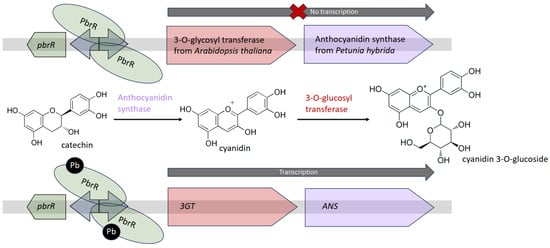 Sensory module pbrR continues to prove remarkably useful when used in conjunction with a bicistronic synthetic cyanidin 3-O-glucoside biosynthetic cassette (Figure 5), referred to as colored anthocyanidin derivatives or CACD in this study [62]. Genes from the biosynthetic cassette coding for 3-O-glycosyltransferase and anthocyanidin synthase were PCR amplified and cloned onto the previously referenced pPpbr-vio plasmid to generate pPb-CACD. The recombinant plasmid was transformed into E. coli TOP10 cells to create the E. coli TOP10/CACD biosensor.