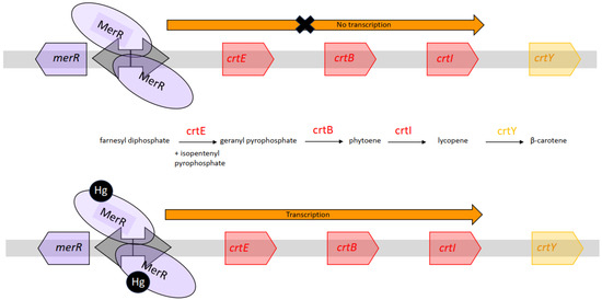 Inorganic Hg-dependent transcription of the genes involved in the β-carotene synthesis pathway. Adapted from [37].