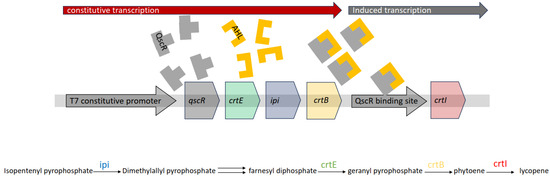 To detect AHLs specific to P. aeruginosa and Burkholderia pseudomallei, two waterborne bacterial strains resistant to disinfection and environmental stress, Wu et al. developed a lycopene-producing biosensor [93]. To detect N-3-hydroxydecanoyl homoserine lactone, N-3-oxododecanoyl homoserine lactone, and N-decanoyl-L-homoserine lactone produced by B. pseudomallei and P. aeruginosa, the QscR quorum-sensing system was used as a sensing module in E. coli. In preliminary stages, the researchers used green fluorescent protein as a reporter. The sensing module consisted of the transcription factor QscR, placed under the control of a constitutive T7 promoter in plasmid pET23b(+), capable of binding to AHLs secreted by both bacterial strains. Upon its formation, the QscR-AHL complex binds to its proprietary binding site a QscR-AHL inducible promoter PA1897 thus engenders the activation of the reporting module EGFP, all components having been cloned into the pUC57kan plasmid. The sensor was found to respond well and selectively to the AHLs being investigated, and the detection threshold was found to be compatible with ecologically relevant amounts of AHLs. To produce the lycopene-based sensor, the lycopene production pathway was introduced in the biosensor by expressing genes crtE and crtB under the T7 constitutive promoter and expressing the gene crtI under the control of the PA1897 promoter in plasmid pET23b-qscR-EIB (Figure 7).