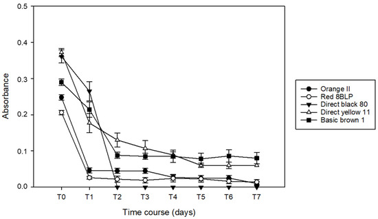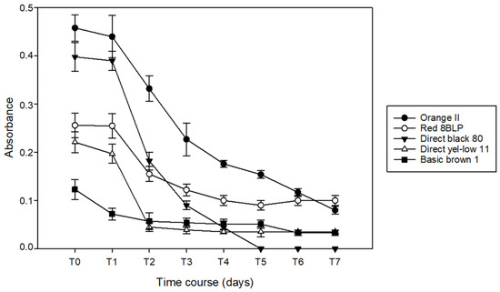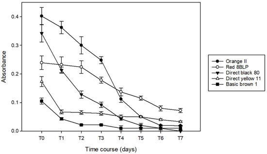 Orange II was removed at 83%, as well as Brown at 73%, whereas Red 8BLP reached a value of 61%. At the end of the 7th day, Direct yellow 11 was decolored at 84% efficiency, the majority of decolorization activity occurring on day 2.