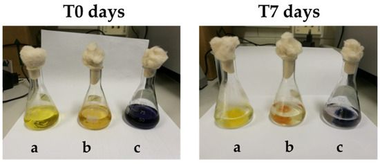 After 7 days of incubation with B. adusta, all dye solutions appeared cleared and transparent, except for the presence of grown fungal mycelia as shown in Figure 2for three dyes. As far as the blank experiment is concerned, no changes in absorbance, and consequently in concentration, were detected for the investigated dyes during the entire duration of the test.