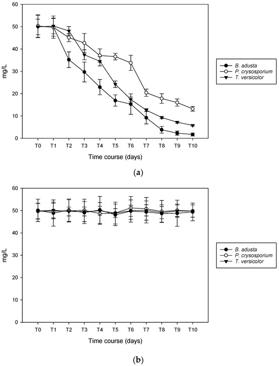 - Korniłłowicz-Kowalska, T.; Rybczyńska-Tkaczyk, K. Growth Conditions, Physiological Properties, and Selection of Optimal Parameters of Biodegradation of Anticancer Drug Daunomycin in Industrial Effluents by Bjerkandera adusta CCBAS930. Int. Microbiol. 2020, 23, 287–301. [Google Scholar] [CrossRef] [PubMed]