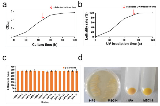 3.2. The Ability of the Mutagenized Strain 14P9 to Produce β-Carotene Was Significantly Increased