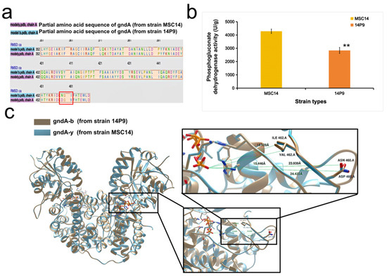 Identification of the ability of MSC14 to synthesize carotenoids and differences in yield in different media. (a) Amino acid sequences of proteins corresponding to sequence variation in the gndA gene in strain 14P9 compared to strain MSC14, with the selected differential proteins in the red boxes; (b) comparison of phosphogluconate dehydrogenase activity, with error bars representing the standard deviation in the bar graphs, and ** representing the t-test, p < 0.01; (c) phosphogluconate dehydrogenase of strain MSC14 and strain 14P9 three-dimensional structure modeling.