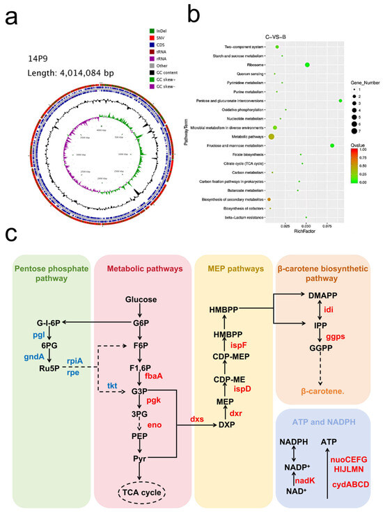Mutation information of strain 14P9 and transcriptomics analysis with strain MSC14. (a) Gene completion diagram for strain 14P9; (b) differential gene KEGG enrichment bubble diagram for strain 14P9 vs. strain MSC14; (c) changes in the expression of genes related to β-carotene synthesis in strain 14P9 compared to strain MSC14, genes marked in red indicates up-regulated expression and genes marked in blue indicates down-regulated expression.