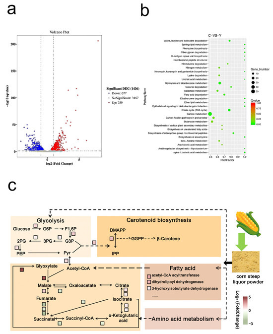 Transcriptomics analysis of strain MSC14 in LB medium containing corn steep liquor powder and regular LB medium. (a) Differential gene volcano map; (b) differential gene KEGG enrichment bubble diagram; (c) schematic diagram of up- and down-regulated genes in the pathway associated with corn steep liquor powder affecting β-carotene yield, the colors of different squares represent the folds of differential expression of the genes.