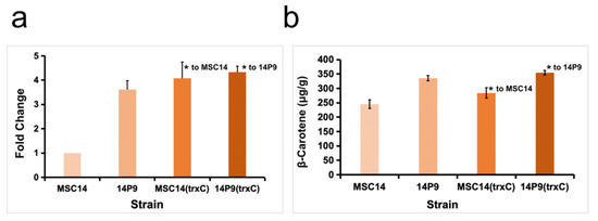 The RT-qPCR results showed that the trxC transcript level of strain MSC14 (trxC) was 4.08 times higher than that of the empty vector control strain MSC14, and that the trxC transcript level of strain 14P9 (trxC) was 1.20 times higher than that of the empty vector control strain 14P9 (Figure 6a). The fermentation results showed that, after 48 h of fermentation in LB medium, the β-carotene content of strain MSC14 (trxC) increased by 15.47% compared to the control strain MSC14, and the β-carotene content of strain 14P9 (trxC) increased by 5.79% compared to that of strain 14P9 (Figure 6b).