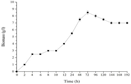 The growth pattern of pure algal strain S. limacinum ATCC MYA-1381, in terms of biomass as a function of time, was monitored, as shown in Figure 1. It was found that the cell culture came up and reached the log or exponential growth phase at about 10 h and reached the maximum biomass at about 8.5 g/L after 72 h cultivation.